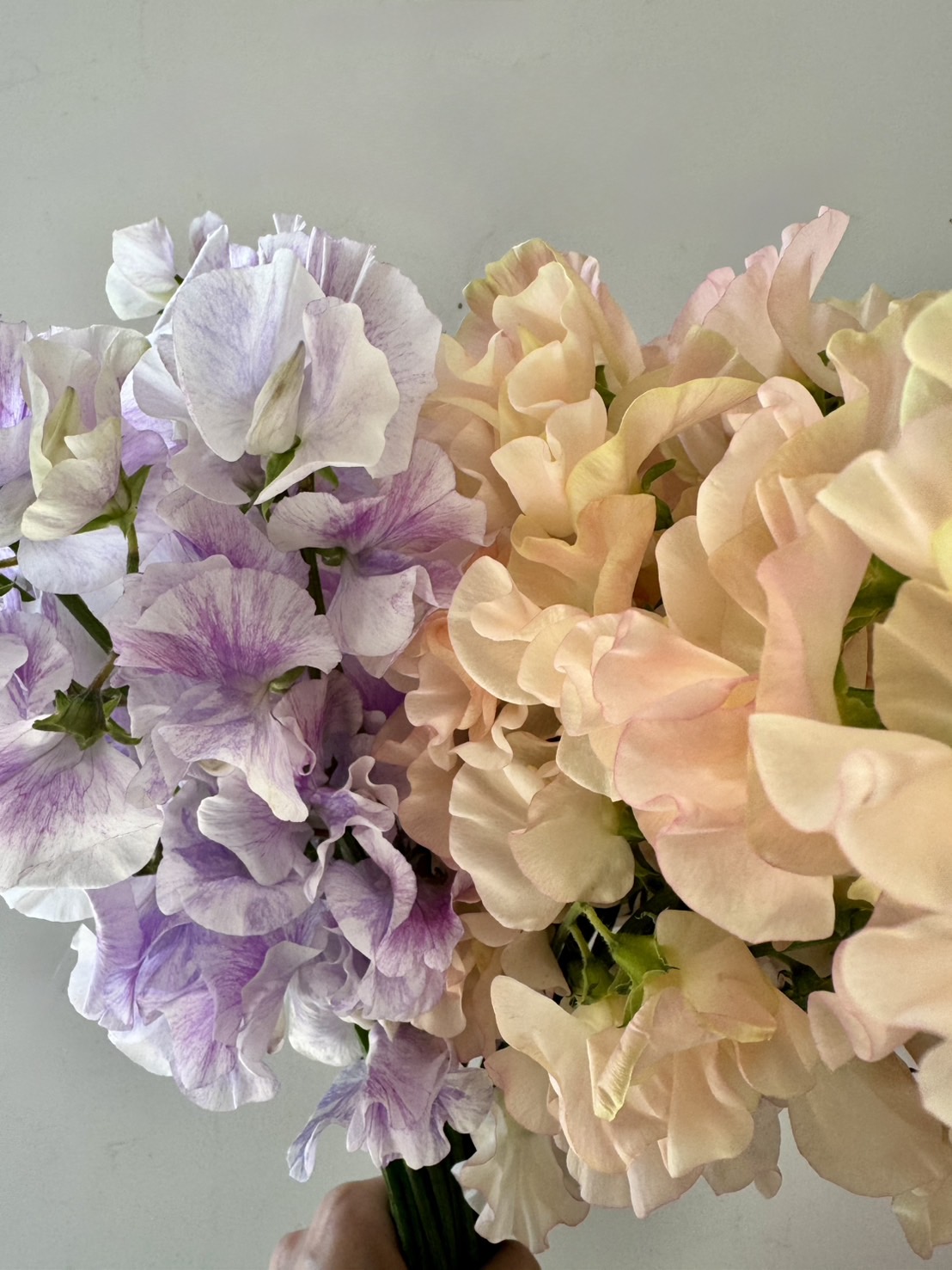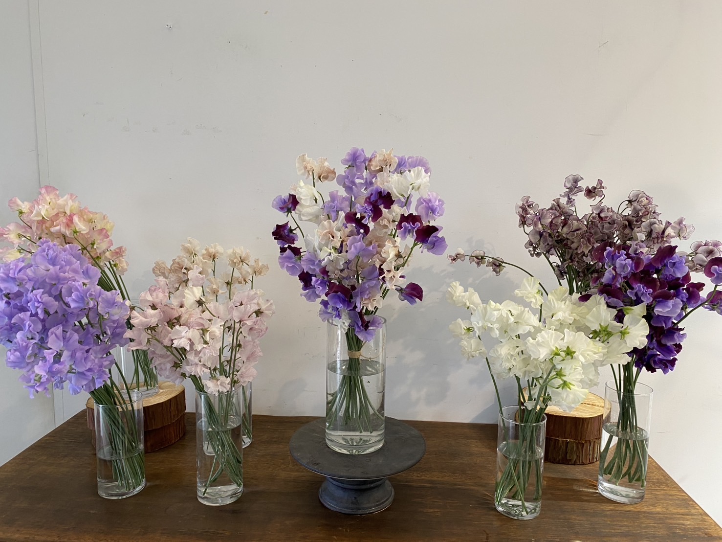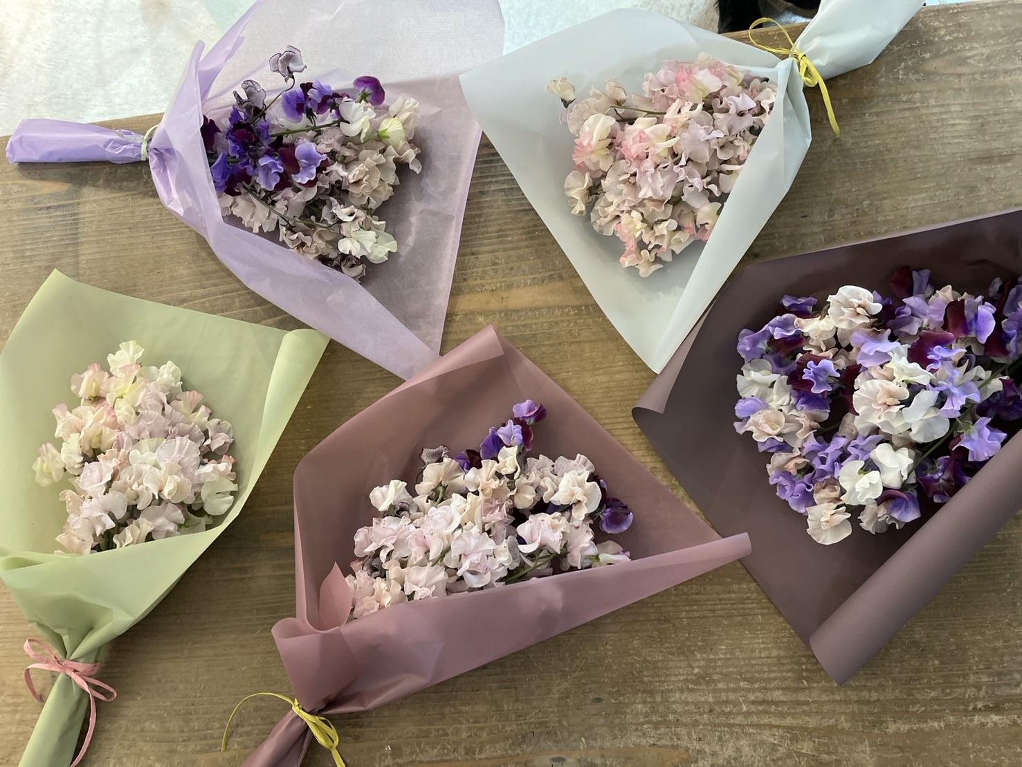 華やかで甘い香りが魅力の旬の染スイートピーを贅沢に使ってブーケを作ります。スイートピーのフリルの重なりを意識して素敵なブーケを作りましょう。